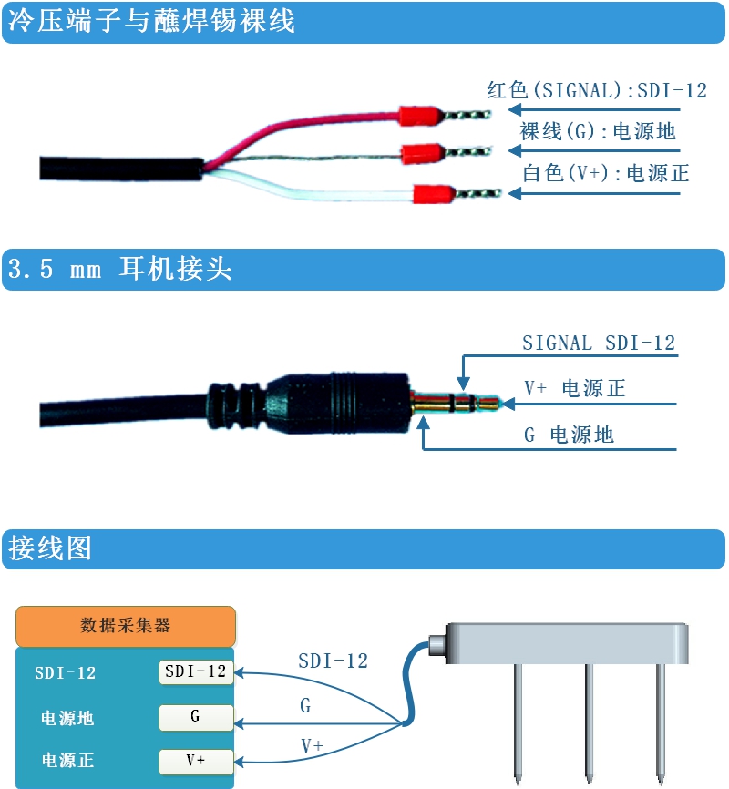 SDI-12冷壓端子接線 SDI-12蘸焊錫裸線 |