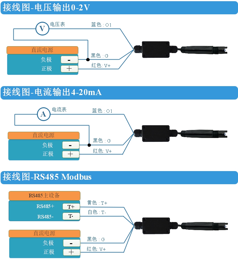 電流輸出4-20mA RS485接口,Modbus協(xié)議 RS485接口,Modbus協(xié)議 & 電壓0-2V輸出 RS485接口,Modbus協(xié)議 & 電流4-20mA輸出 SDI-12接口 客戶訂制 |